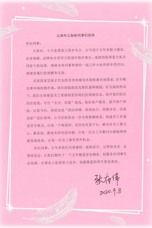 在江蘇雁藍檢測科技有限公司成立五周年之際,總經理張布偉發出給同事們的信,信中肯定雁藍檢測這五年來奮斗的成績,感謝全體同事和曾經一起工作過的小伙伴的辛苦付出,展望下一個五年,希望雁藍人既能守住雁藍檢測的“安全、質量”底線,做好客戶服務,提升客戶體驗,又能不斷進步打造一個暢通、良性發展平臺,為員工謀福利,讓我們期待下一個五年雁藍更精彩。